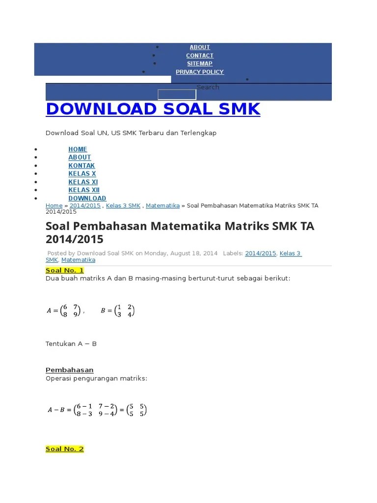Pembahasan soal un matematika sma program ipa 2012 paket b21 zona d from . Matriks paket soal soal dan pembahasan3 5 3 1soalnomordiketahui matriks a , b dan c . Soal dan pembahasan matriks materi sma kelas 11 matematika wajib. Text of pembahasan soal un 2012 matriks. Atau smmptn (seleksi mandiri masuk perguruan tinggi negeri) dan un (ujian nasional).